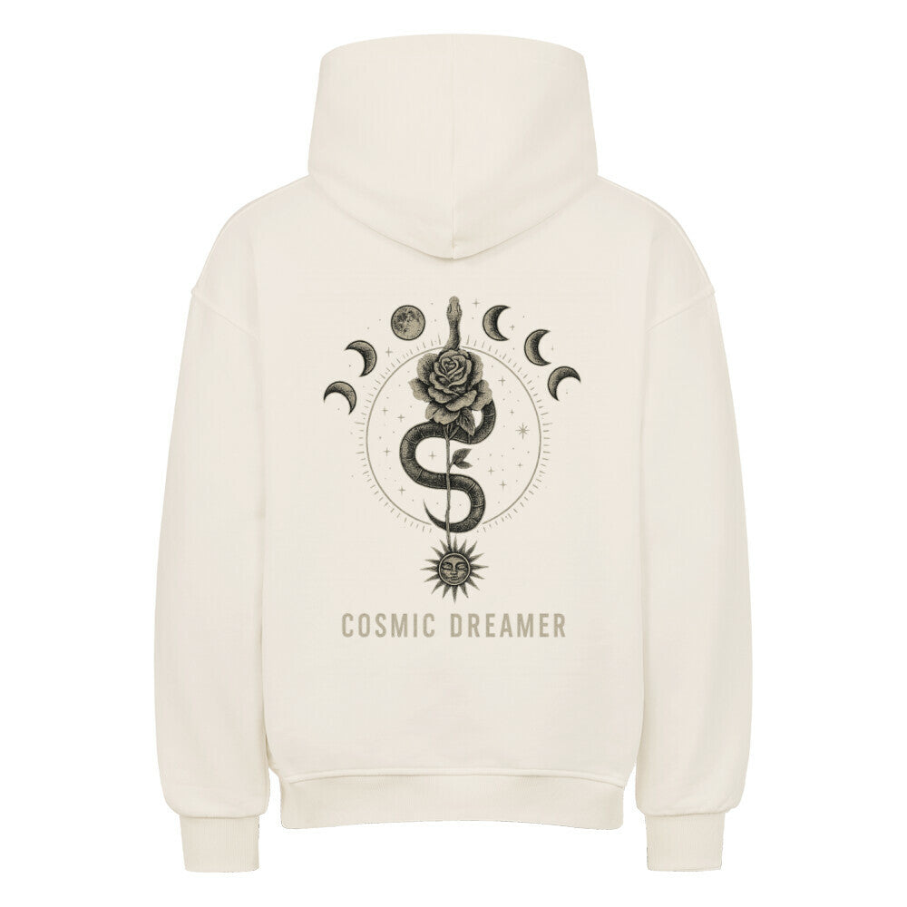 Trage den Kosmos auf deiner Haut – unser „Cosmic Dreamer“- Oversized Hoodie ist ein Mix aus Spiritualität, Astrologie und Tattoo-Art. Die Schlange als Symbol der Transformation, die Rose für das Herz und die Sonnen-Mond-Elemente machen dieses Design zu einem tiefsinnigen Statement für freie Seelen.