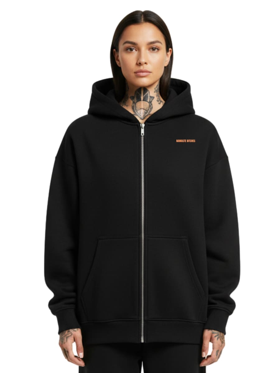 Mach dein Statement mit unserem Oversized Zipper Hoodie mit Reißverschlusst „Namaste Bitches“. Die gefalteten Hände im knalligen Orange, umgeben von einem feinen Mandala, treffen auf tätowierte Arme und pure Attitude. Ob beim Yoga, im Alltag oder als Highlight auf der Straße – dieses Shirt sagt alles, ohne ein Wort zu verlieren.